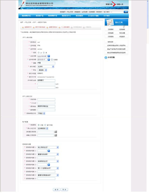 填写个人信息,设置密码保护问题及交易密码,选择进行风险属性测试